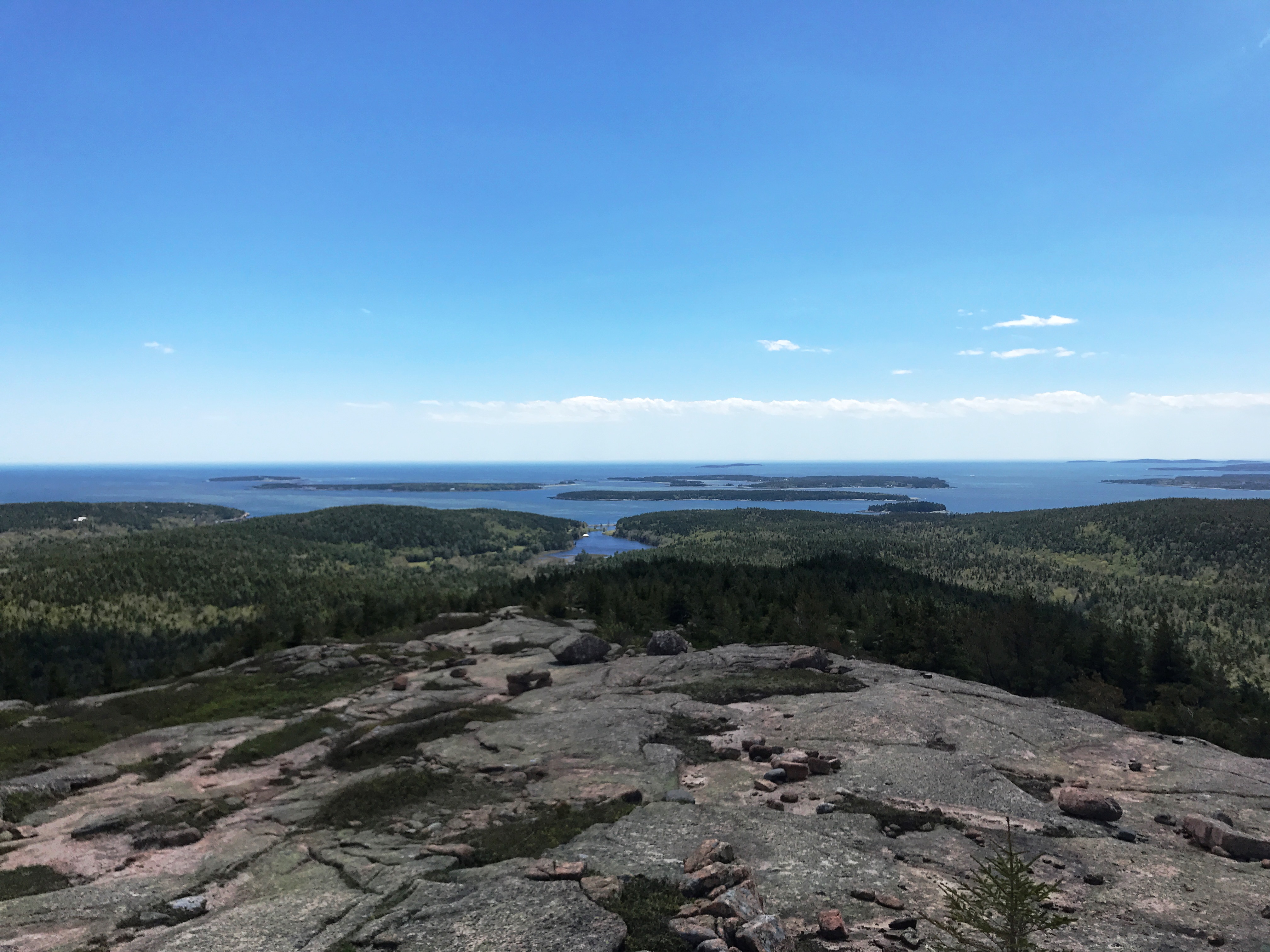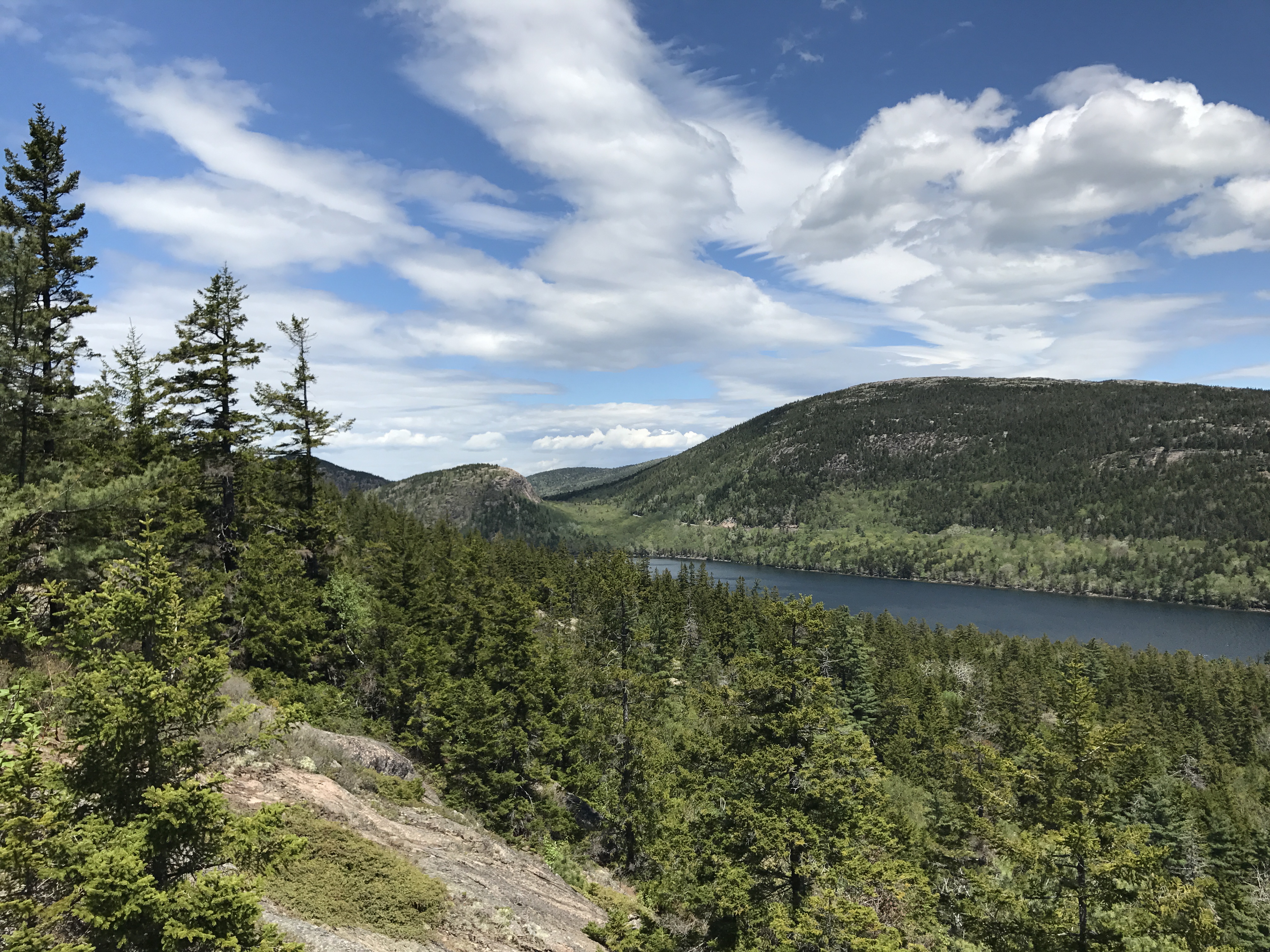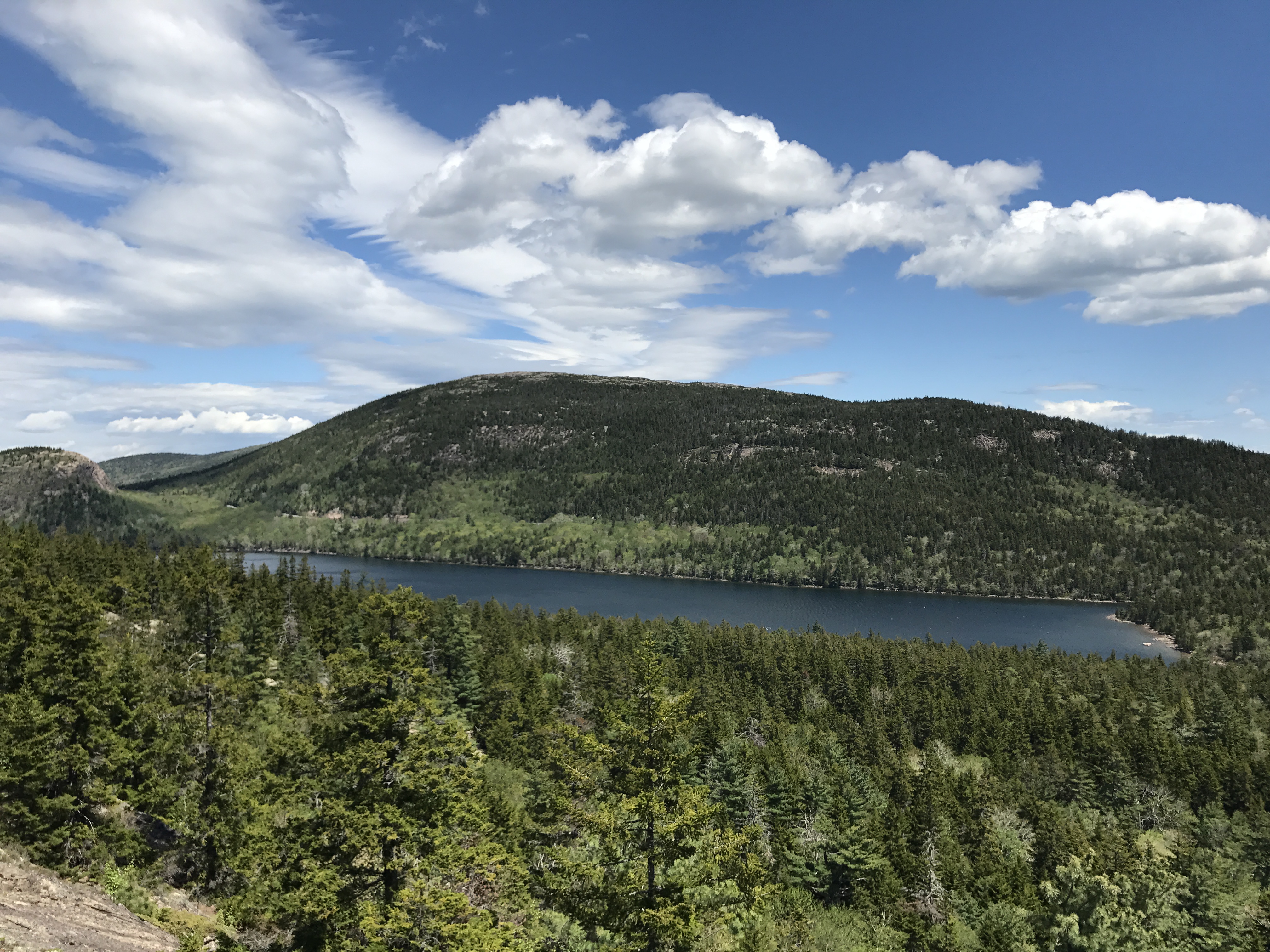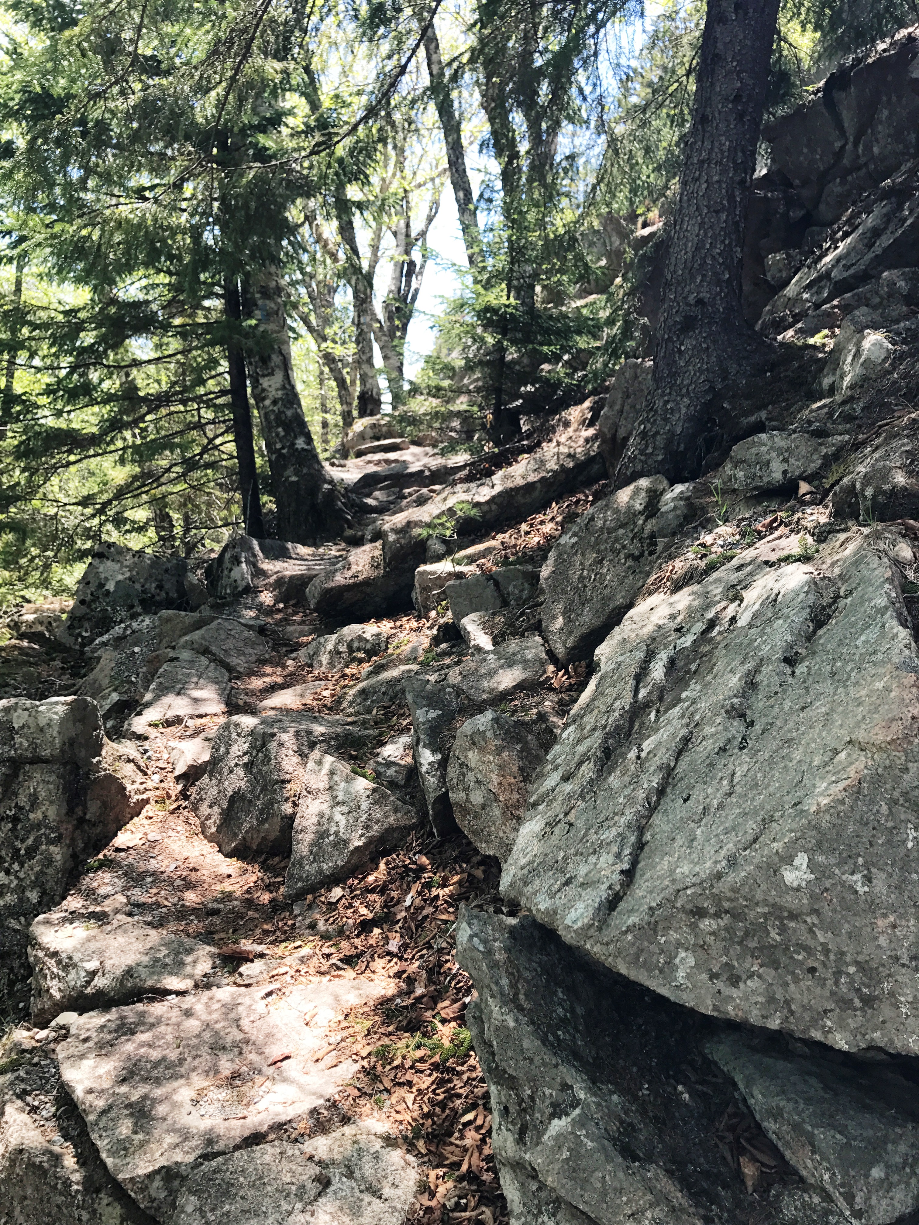 On this day, the mountain kicks me a bit. As I hit the challenge of Spring Trail on the way up, I sense the heaviness in my body and the challenge of the rocky climb up the boulders. I take extra care in the areas where you need to watch your step and use the iron rungs for safety. It takes me extra time in the spot where you must creatively hoist your whole self up the steep bolder. And when I reach the Jordan Pond Overlook less than .5 miles in, I pause to appreciate the view before ascending up the open face of the mountain.