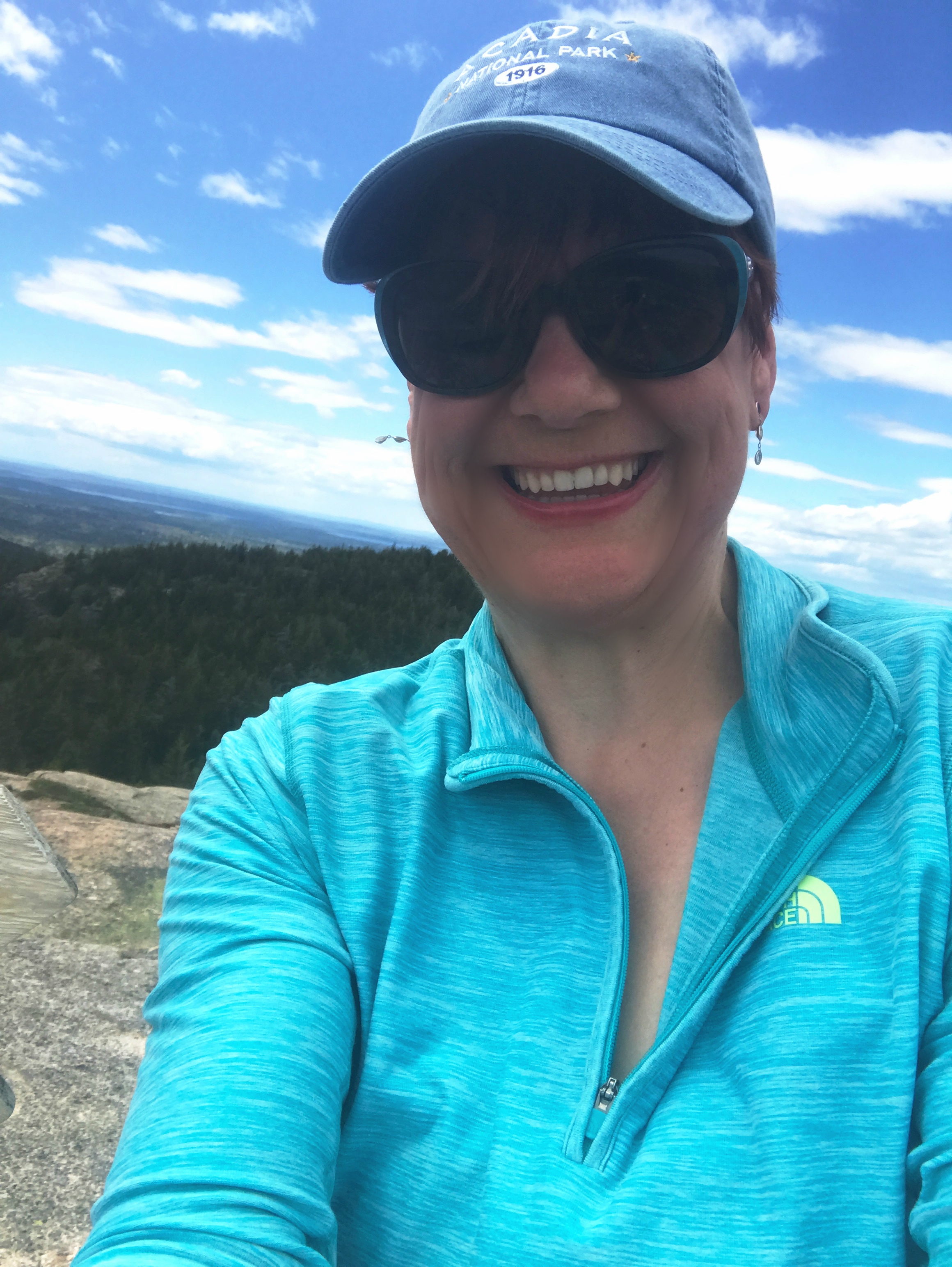 Perhaps it’s the extra five pounds I’m carrying on my body, the fact that I’m climbing with a backpack, or my age — whatever it is, this climb feels more difficult than the last. But I keep going, encouraging myself along the way — “You’ve got this, Lor. You know the way.” As I take note of the extra challenge, I appreciate each step forward and the amazing views on the ascent. I notice that the sun is harsh, the air heavy and humid like Maine summer, and it’s really, really, really windy. On the open face of the mountain, I need more water and must retrieve my hat from the mountain ledge multiple times.